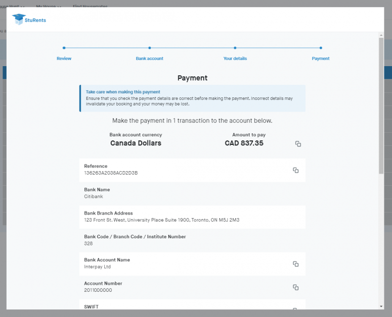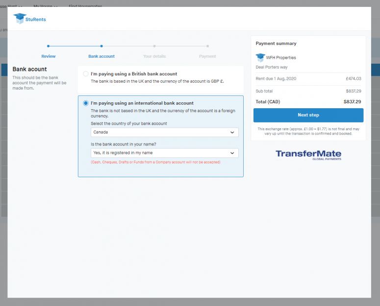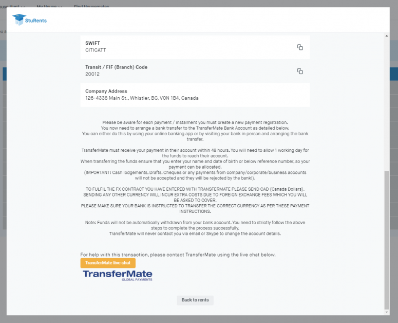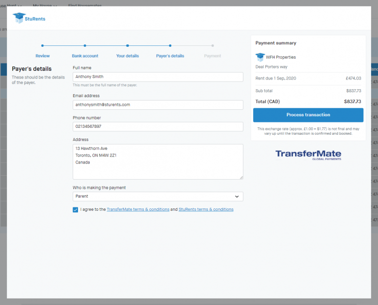 Agree to the TransferMate terms & conditions and the StuRents terms & conditions.
