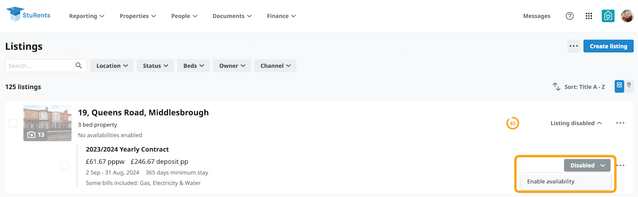 If your property has no enabled availabilities click on the grey text “Listing disabled” to see a list of your contract terms (availabilities).